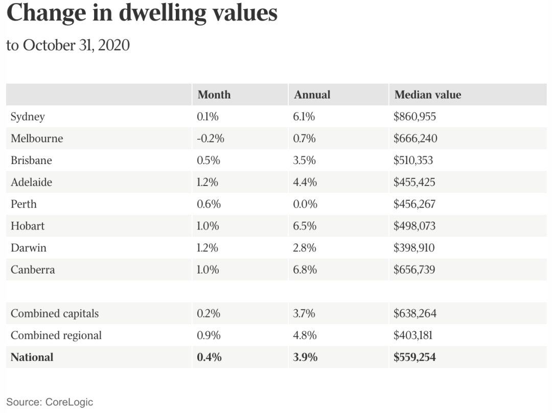 不過(guò)根據(jù)地產(chǎn)研究機(jī)構(gòu)CoreLogic最新的數(shù)據(jù)顯示:自疫情爆發(fā)以來(lái),澳洲房?jī)r(jià)首次出現(xiàn)了整體上漲,10月份澳洲全國(guó)住宅房產(chǎn)價(jià)格整體上漲了0.4%,中位價(jià)達(dá)到559254澳元。除了遭受第二波疫情的墨爾本房?jī)r(jià)仍有小幅下降之外,其他首付城市房?jī)r(jià)均在上漲。業(yè)內(nèi)專業(yè)人士稱,各種數(shù)據(jù)表明澳洲房市或以觸底。