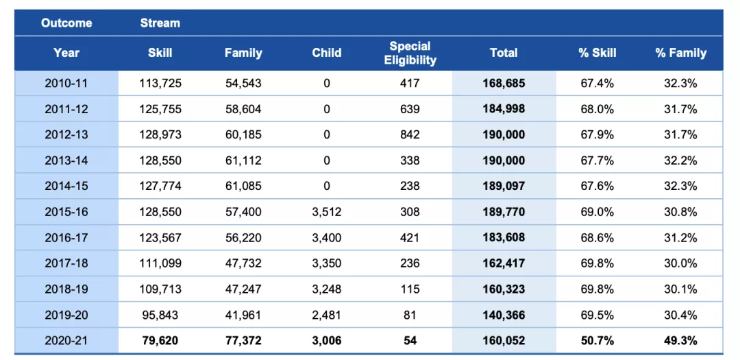 與過往財年相比,2020-21財年技術(shù)移民發(fā)放量進(jìn)一步縮減,家庭簽證發(fā)放量大增。