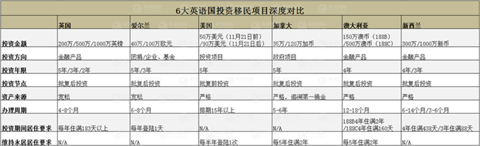 那么,全球6大英語(yǔ)國(guó),各自的投資移民政策是怎樣的?哪國(guó)更適合您呢?小銘從移民家庭最關(guān)心的投資金額、投資期限、資金來(lái)源、辦理周期、居住要求等方面,詳細(xì)梳理了6大英語(yǔ)國(guó)投資移民項(xiàng)目深度對(duì)比表,供大家參考。