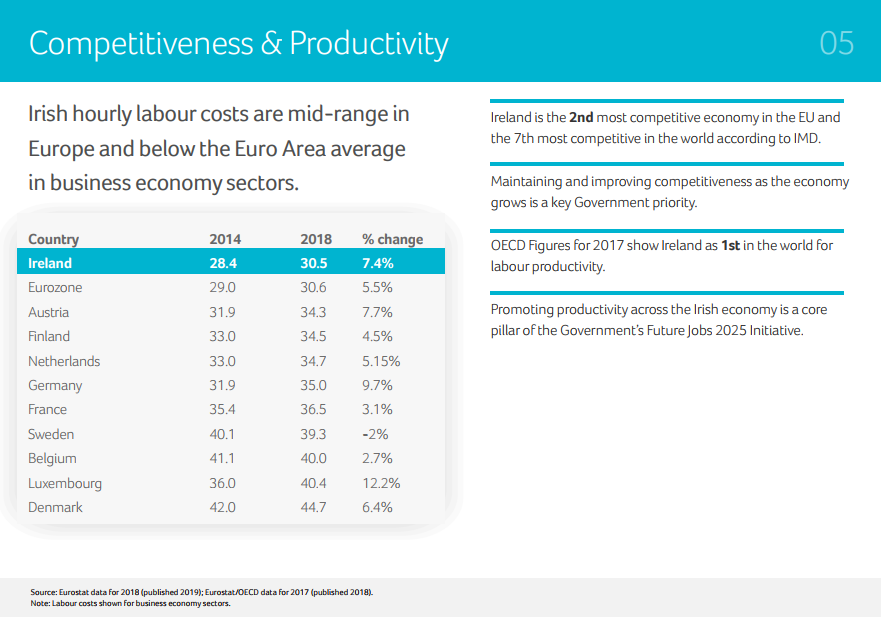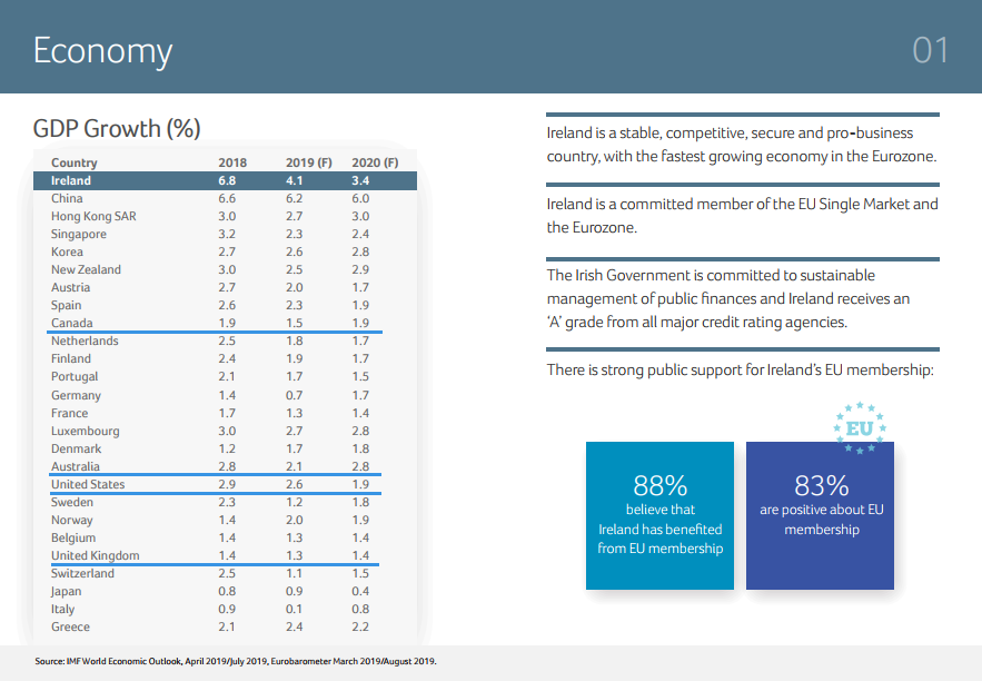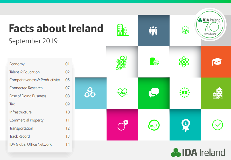 近日,愛爾蘭投資發(fā)展局(IDA)公布了2019年最新的Facts about Ireland。報(bào)告用清晰的數(shù)據(jù),呈現(xiàn)了愛爾蘭在經(jīng)濟(jì)、教育、全球競(jìng)爭(zhēng)力、稅收等方面的全球排名和地位。