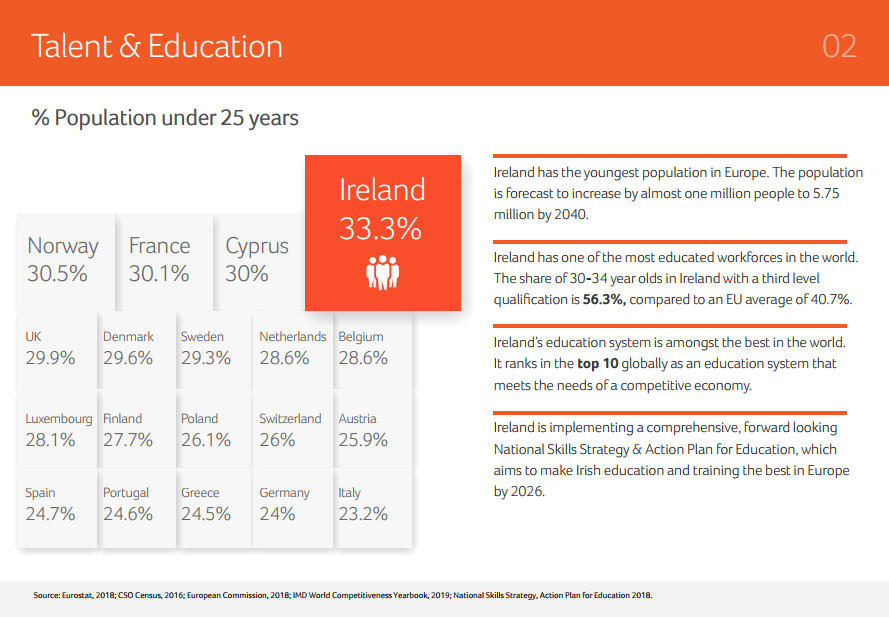 愛爾蘭的確擁有歐洲最年輕的人口,25歲以下群體占愛爾蘭人的1/3。愛爾蘭沿用英式教育,教育系統(tǒng)排名全球前十,近30%學(xué)生在科學(xué)、技術(shù)、工程和數(shù)學(xué)(STEM)領(lǐng)域深造。愛爾蘭30-34歲的年輕人中有56.3%接受了高等教育,位居歐洲第一。同時(shí),愛爾蘭在吸引和留住國(guó)際人才方面排名全球第一。
