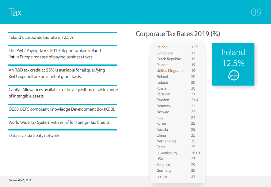 愛爾蘭企業(yè)稅率僅12.5%,據(jù)PwC發(fā)布的“Paying Taxes 2019”報(bào)告,愛爾蘭在企業(yè)稅收優(yōu)惠方面,排在歐洲首位。得益于愛爾蘭優(yōu)惠的稅收政策及利商的經(jīng)濟(jì)環(huán)境,在愛爾蘭投資的跨國(guó)公司中,有1/3企業(yè)已在愛爾蘭開展業(yè)務(wù)20余年。