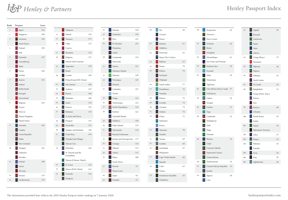 1月7日,2020亨氏護(hù)照指數(shù)(Henley Passport Index 2020)正式發(fā)布。