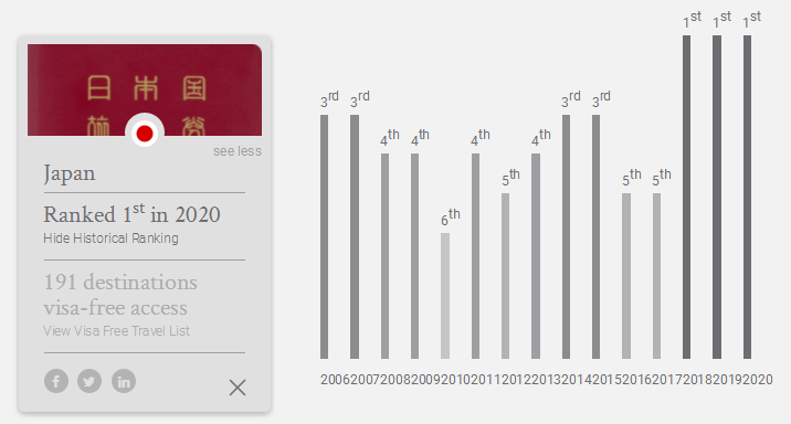 根據(jù)這份最新榜單,2020年亞洲、歐洲國(guó)家表現(xiàn)強(qiáng)勁,包攬全球暢行榜TOP10,亞洲國(guó)家更是霸榜全球TOP3。其中,日本護(hù)照第三年蟬聯(lián)榜首,免簽/落地簽191個(gè)目的地;新加坡護(hù)照排第二,可免簽/落地簽190個(gè)目的地;韓國(guó)和德國(guó)護(hù)照并列第三,能免簽/落地簽189個(gè)目的地。