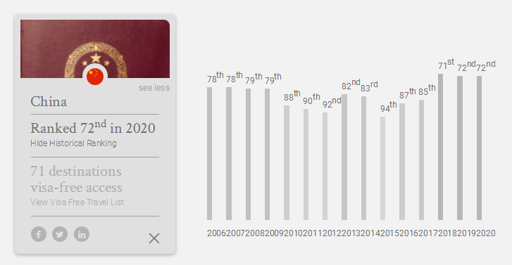 此外,大家非常關(guān)注的中國(guó)大陸護(hù)照,今年和去年一樣排在第72位,有71個(gè)免簽/落地簽?zāi)康牡亍V袊?guó)香港排第20位,免簽/落地簽169個(gè)目的地;中國(guó)澳門排第34位,免簽/落地簽144個(gè)目的地;中國(guó)臺(tái)灣排第32位,免簽/落地簽146個(gè)目的地。