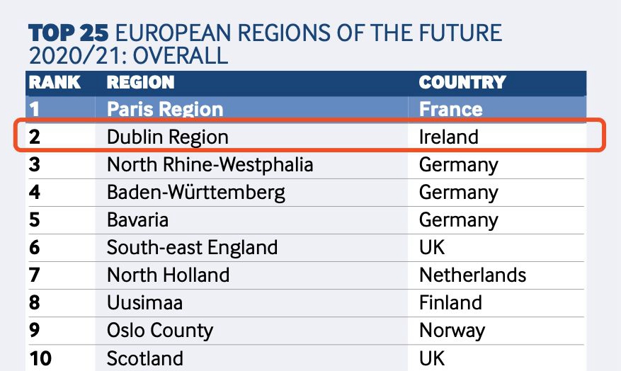 據(jù)最新發(fā)布的《2020/21歐洲未來城市和地區(qū)》排名顯示,都柏林地區(qū)在“歐洲最佳投資地區(qū)”排名中榮獲第二名,被列為外國直接投資首選地區(qū)之一。