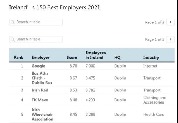 愛(ài)爾蘭本土公司都柏林公交排名第二,愛(ài)爾蘭鐵路公司排名第三,美國(guó)零售商TK Maxx位居第四,愛(ài)爾蘭輪椅協(xié)會(huì)排名第五。