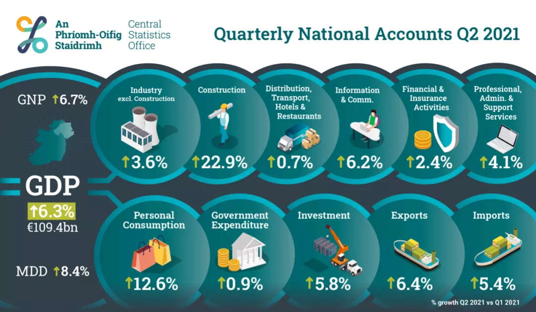 日前,愛爾蘭中央統(tǒng)計局(CSO)發(fā)布最新數(shù)據(jù):與第一季度相比,愛爾蘭2021年第二季度的經濟增長了6.3%,該數(shù)據(jù)是歐洲所有國家中增長最高的。