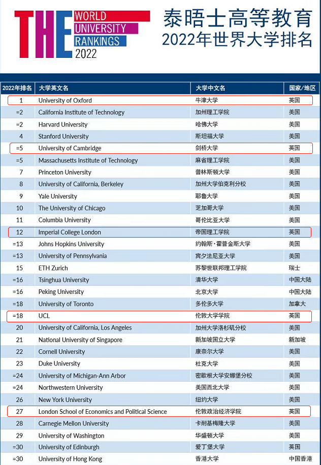 日前,2022年度泰晤士高等教育(THE)世界大學(xué)排名出爐,英國牛津大學(xué)連續(xù)第六年蟬聯(lián)榜首,劍橋大學(xué)與麻省理工學(xué)院并列全球第五,英國G5院校(牛津大學(xué)、劍橋大學(xué)、帝國理工學(xué)院、倫敦大學(xué)學(xué)院和倫敦政治經(jīng)濟學(xué)院)全部排名世界前30。毫無疑問,英國高等教育水平始終位居世界頂尖之列。