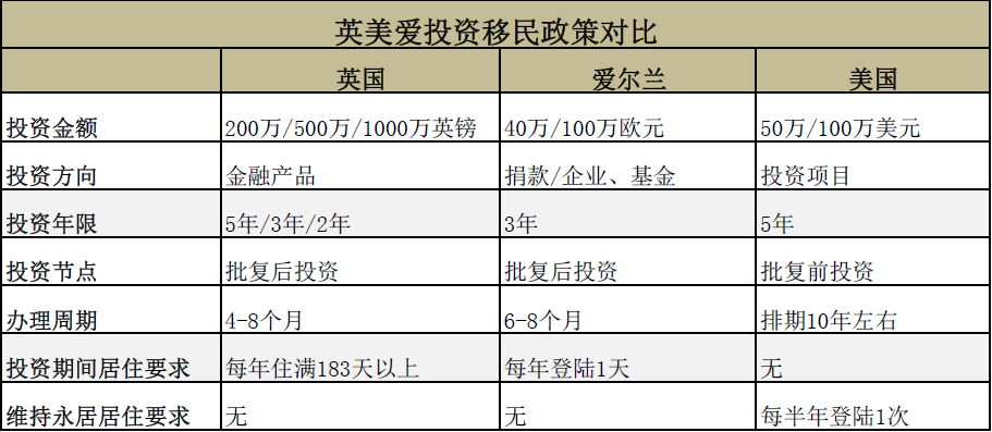 通過對比可以看出:英國投資移民門檻最高;美國需要在獲得批復(fù)前投資,投資風(fēng)險較大,且排期極長(目前美國EB-5區(qū)域中心項目處于暫停狀態(tài));愛爾蘭投資門檻居中,投資期限較短,辦理周期較快,居住要求也極低,僅需每年登陸1天(當(dāng)下疫情期間免除登陸要求)。