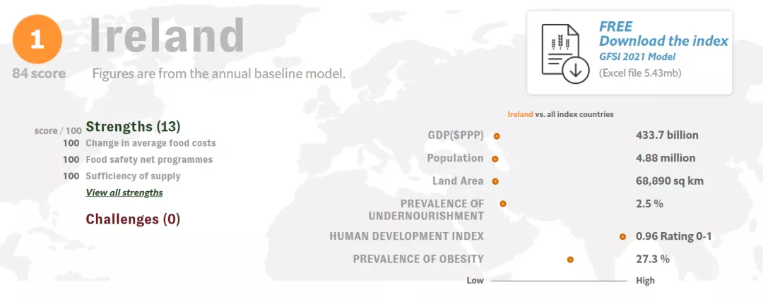 全球食品安全指數(shù)(Global Food Security Index,簡(jiǎn)稱GFSI)排名已經(jīng)發(fā)行了10年,在歷次排名中,愛爾蘭一直高居榜單前列。2014、2017年排名第一,2019、2020年位居第二。