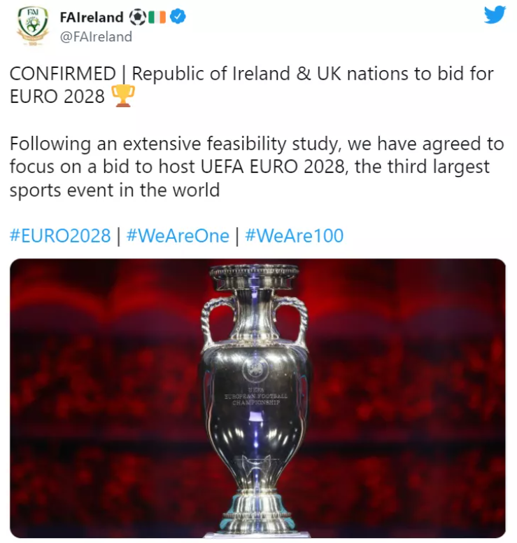 據(jù)悉,歐足聯(lián)計劃在2028年將歐洲杯從24隊擴張到32隊,許多歐洲相關(guān)機構(gòu)認為英國和愛爾蘭舉辦歐洲杯將帶來商業(yè)上的巨大成功,特別是考慮到很多基礎設施已經(jīng)到位。