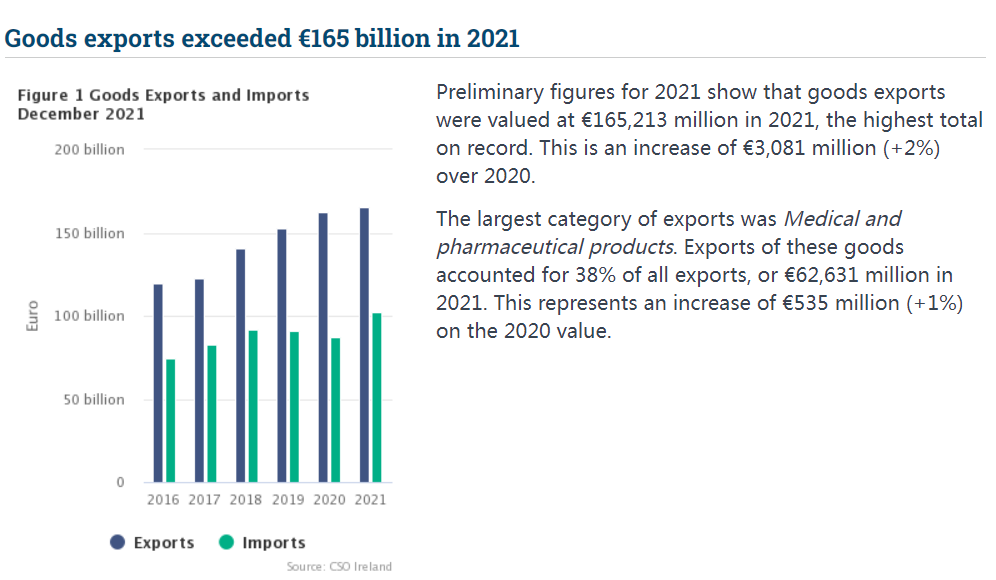 愛爾蘭中央統(tǒng)計(jì)局(CSO)最新數(shù)據(jù)顯示:繼2020年愛爾蘭出口額達(dá)到創(chuàng)紀(jì)錄的1620億歐元(比2019年增長6.6%)后,2021年愛爾蘭的出口總額又創(chuàng)下新紀(jì)錄,達(dá)到1652億歐元,同比增長2%。