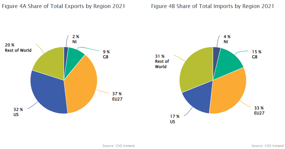 在出口地域分布方面,歐盟在愛爾蘭2021年的出口總額中占37%,達(dá)615億歐元。美國仍然是愛爾蘭最大的單一出口目的地,占去年出口總額的32%,達(dá)525億歐元。英國占出口總額的11%,達(dá)181億歐元。中國占出口總額的7%,達(dá)119億歐元。
