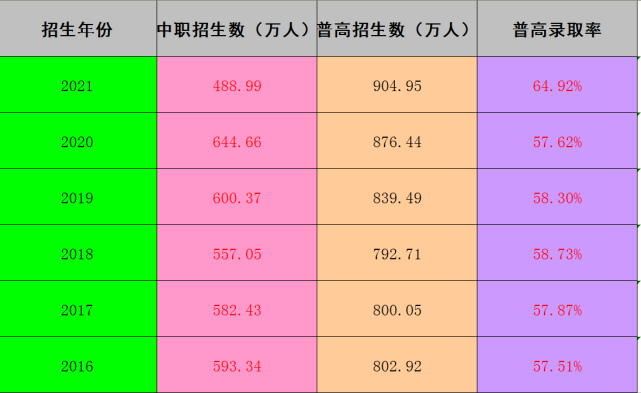 從上圖看,2016年至2021年,全國普通高中招生人數(shù)從802萬提高到904萬,增幅達(dá)12.5%。雖然普通高中的錄取率逐年提升,但是每年仍有數(shù)百萬學(xué)生被分流到職業(yè)學(xué)校學(xué)習(xí)。