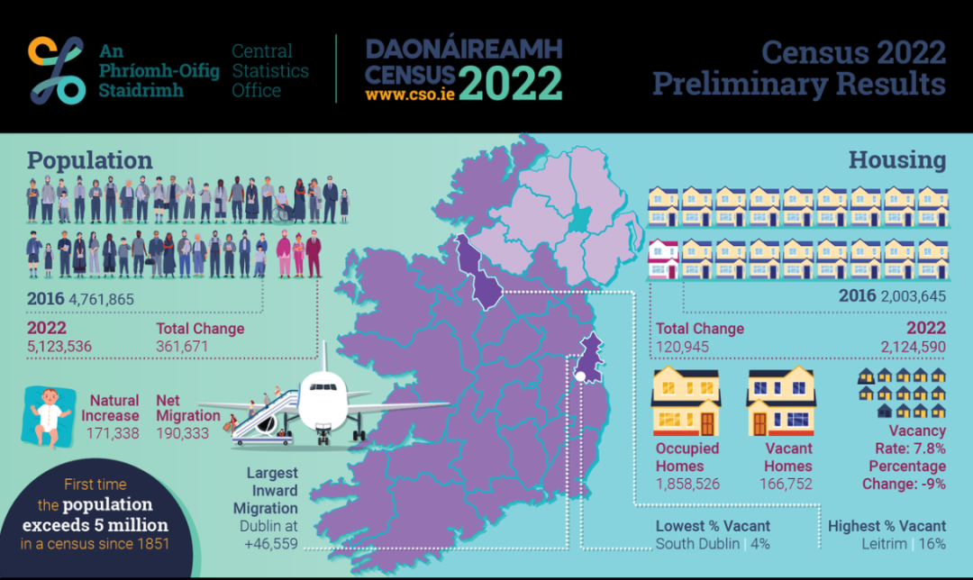 愛爾蘭中央統(tǒng)計(jì)局(CSO)6月中旬公布了《2022人口普查報(bào)告》初步數(shù)據(jù)。報(bào)告顯示:截至2022年4月3日的普查日,愛爾蘭總?cè)丝谠鲩L(zhǎng)至512萬(wàn)3536人,這是自1841年人口普查以來(lái),錄得的最高數(shù)據(jù),也是自1851年以來(lái)首次突破500萬(wàn)大關(guān)。