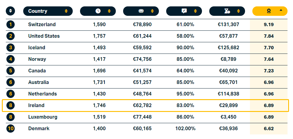 科技公司Tipalti的最新研究結(jié)果顯示,愛(ài)爾蘭是全球最適合工作和創(chuàng)造財(cái)富的國(guó)家之一。在全球近40個(gè)參與評(píng)比的國(guó)家和地區(qū)中,愛(ài)爾蘭“財(cái)富得分”6.89分,位列第8名。愛(ài)爾蘭平均年薪62,782歐元(約合人民幣43.2萬(wàn)元),超越美國(guó)。