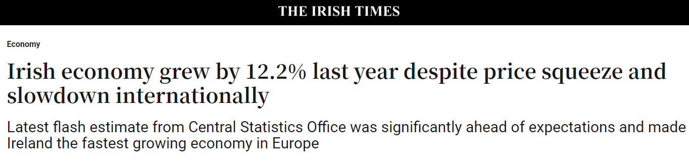 盡管全球經(jīng)濟大幅放緩,但愛爾蘭經(jīng)濟卻仍高速增長12.2%,大大超過政府預(yù)期,再次成為歐盟增長最快的經(jīng)濟體,幾乎是排名第二的葡萄牙(6.5%)的兩倍,是歐盟平均水平(3.3%)的近四倍。