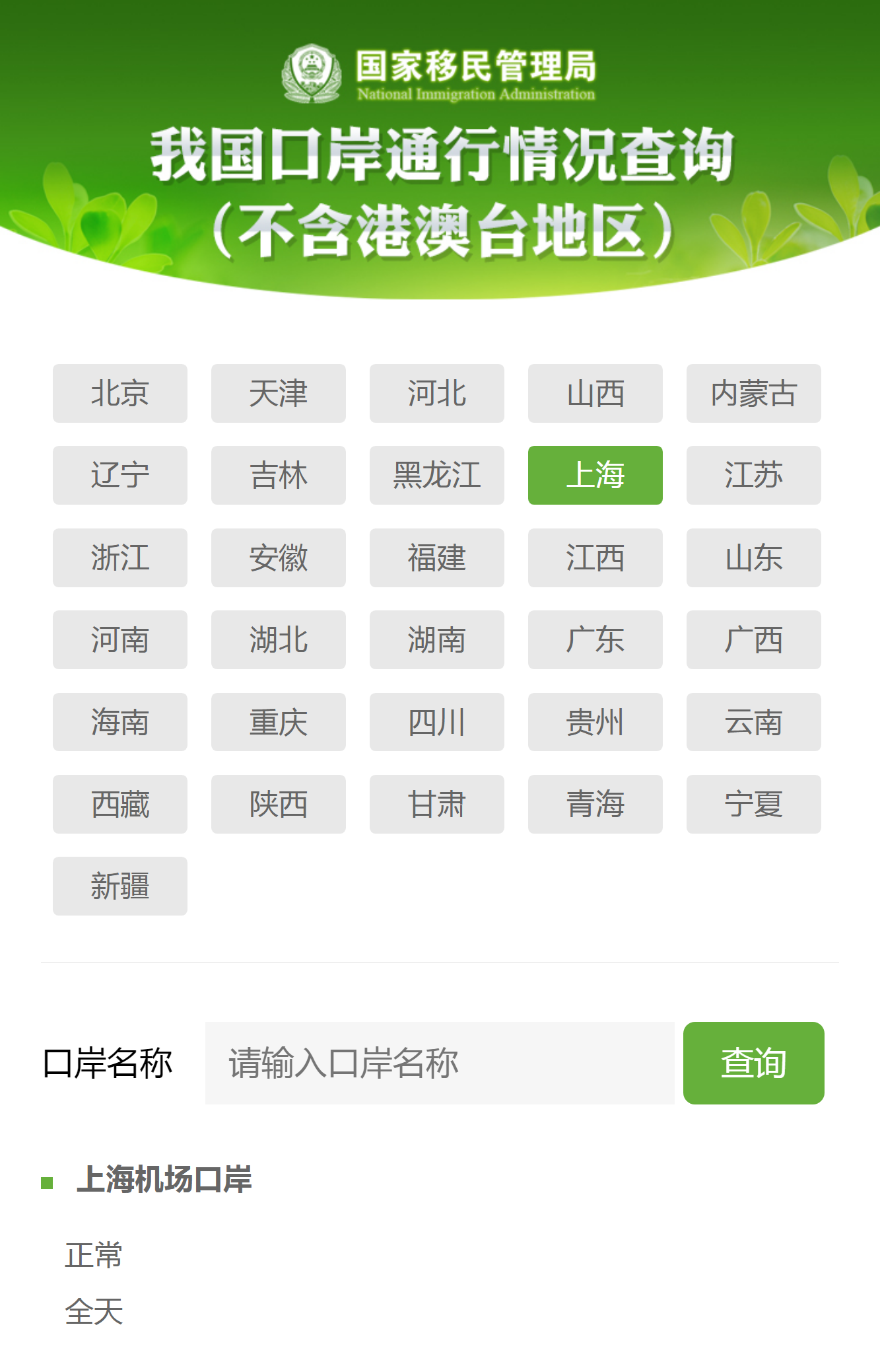 點擊“我國口岸通行情況查詢”,輸入您準(zhǔn)備出入境的口岸名稱,比如“上海機場”,通行情況、開放時間等信息一鍵掌握!
