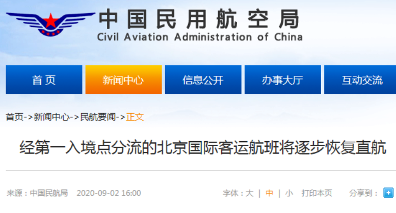 民航局9月2日發(fā)布消息稱,在嚴(yán)格采取防控措施、嚴(yán)格防范輸入風(fēng)險(xiǎn)的前提下,自9月3日起逐步將經(jīng)第一入境點(diǎn)分流的北京國際客運(yùn)航班恢復(fù)直航。