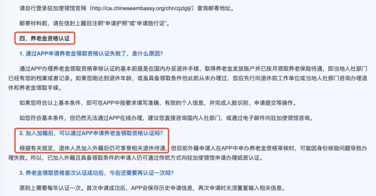 A:根據(jù)有關(guān)規(guī)定,退休人員加入外籍后仍可享受相關(guān)退休待遇,但目前外籍申請人在APP中申辦養(yǎng)老金資格審核時(shí),可能因身份核驗(yàn)問題導(dǎo)致辦理失敗。所以,已加入外籍且具備領(lǐng)取條件的申請人仍可通過傳統(tǒng)方式向駐加使領(lǐng)館申請辦理紙質(zhì)認(rèn)證。