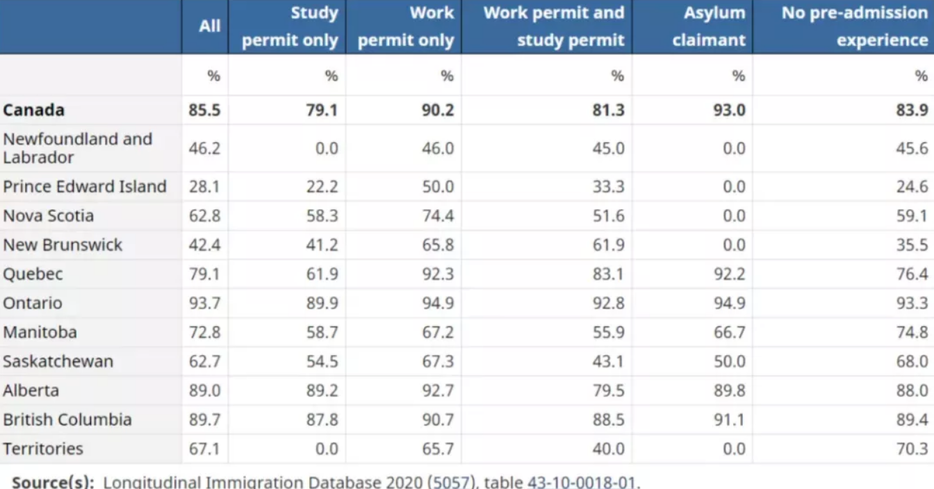 在加拿大工作或?qū)W習(xí)的經(jīng)歷會(huì)影響移民在不同地區(qū)之間移動(dòng)的決定。尤其就業(yè)是留住人才的關(guān)鍵,有工作許可的移民保留率達(dá)到90.2%。