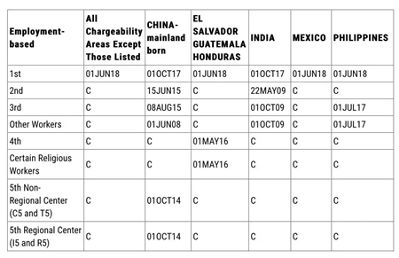 此外,當前熱門的EB-1即將從2018年10月開始正式排期,截止日定格在16年6月,也就是說EB-1正式開始的排期為2年零4個月,辦理EB-1A或L1/EB-1C的家庭也需要開始關(guān)注超齡問題。下面來看下具體的簽證排期表。