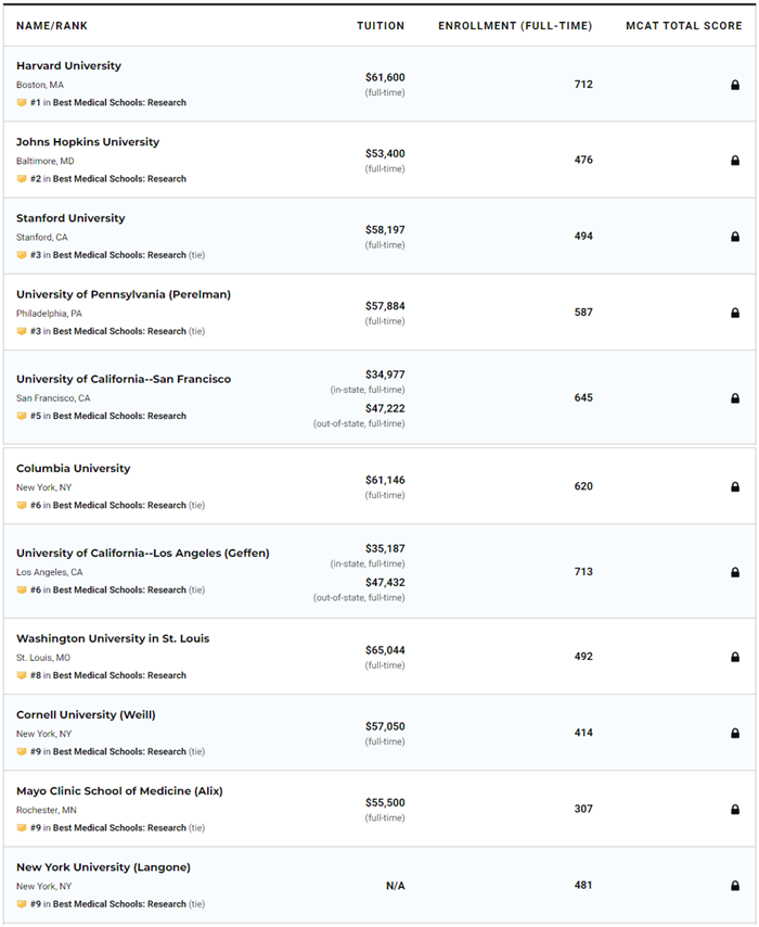 不過,不管是醫(yī)學(xué),還是護(hù)理,國(guó)際生都不多。不是每所醫(yī)學(xué)院都招國(guó)際生(有綠卡的孩子就沒有這層顧忌),部分醫(yī)學(xué)院可能只有一兩個(gè)方向?qū)α魧W(xué)生開放。下面是Research方向的TOP10排名:
