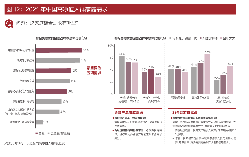 2021年,高凈值人群年輕化趨勢(shì)凸顯,40歲以下高凈值人群成為中堅(jiān)力量,占比42%。縱觀2021年高凈值人群家庭需求,多元化的資產(chǎn)配置、境內(nèi)外子女教育、穩(wěn)健的大類資產(chǎn)配置、代際傳承安排、全球化定制化的產(chǎn)品服務(wù)占據(jù)了前5名。