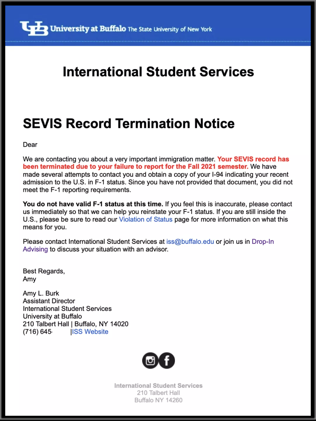今年9月28日,紐約州立大學布法羅(SUNY Buffalo)分校的多名留學生,其中包括至少30名中國留學生,收到校方郵件通知:由于學生未能在開學一個月的時間內(nèi),向?qū)W校的國際學生事務辦公室報到,并遞交I-94副本,校方不再認可其留學生身份,根據(jù)美國相關(guān)的移民法律,這些學生的F-1簽證將被終止,并須盡快離境!