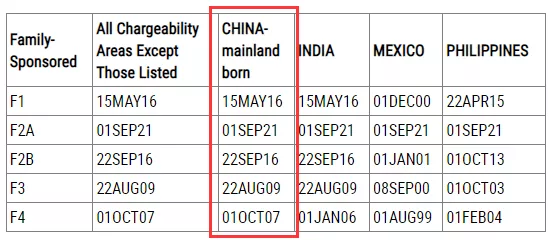 ·親屬移民排期表B,F(xiàn)2A類別前進(jìn)了92天至2021年9月1日,其他類別無變化。