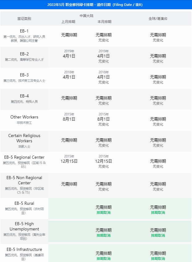美國(guó)5月綠卡排期出爐