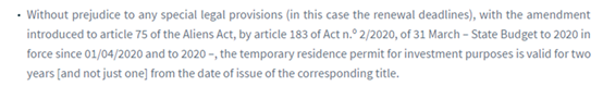 今年4月,葡萄牙頒布了第2/2020號法令,其中的第183條對移民法里居留卡的有效期進行了修改,將黃金居留卡的首次有效期由1年調(diào)整為2年。盡管法案已經(jīng)生效,但卻缺乏法案的具體執(zhí)行細節(jié)。