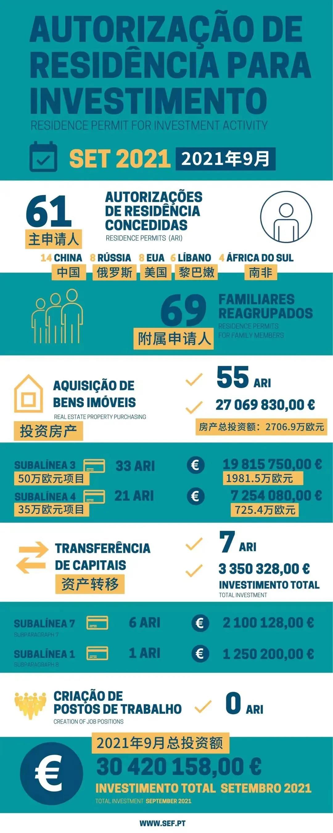 近日,葡萄牙移民局(SEF)發(fā)布了2021年9月份黃金簽證最新數(shù)據(jù)!9月共計61位主申請人攜69位附屬申請人獲批,中國籍主申請人14人,仍然持續(xù)居于首位!俄羅斯第二;美國位居第三。其中有54位主申請人選擇了房產(chǎn)投資(總投資額約為:2707萬歐元),7位申請人通過35萬歐元基金投資和其他投資方式獲批身份,9月份總投資額為3042萬歐元。