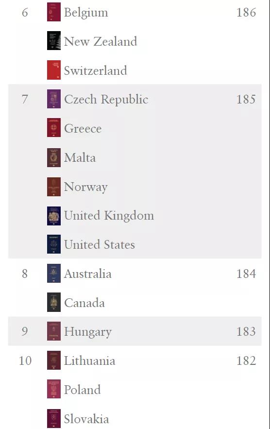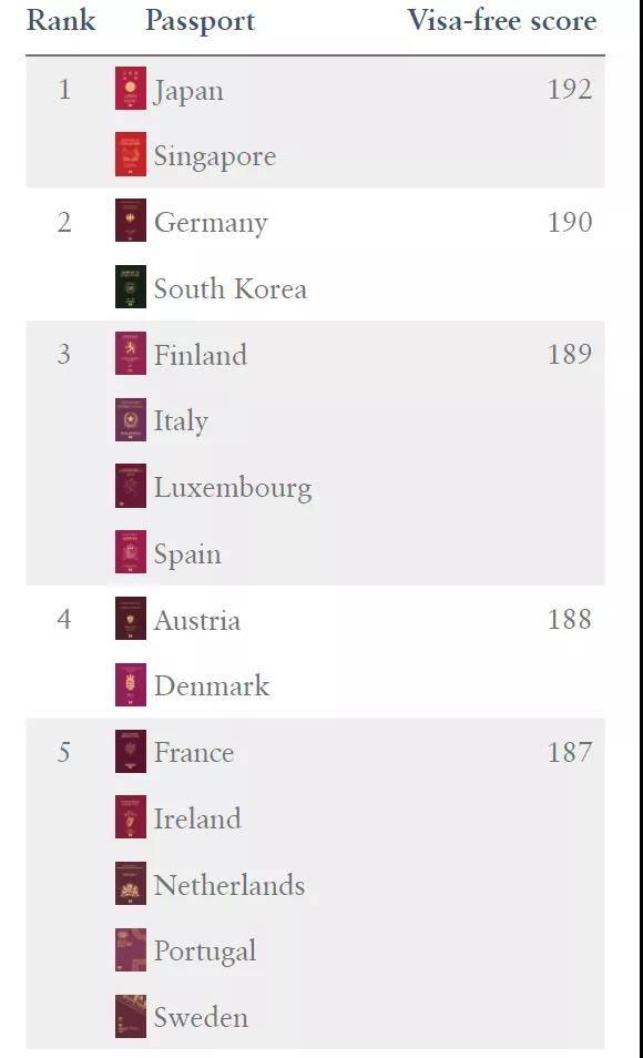 近日,全球最具權威的護照含金量排行榜“亨氏護照指數(shù)”發(fā)布了2021Q4(第四季度)的全球排名。日本、新加坡護照以持有人可以免簽進入世界192個國家和地區(qū)并列第一,德國和韓國以190個免簽數(shù)量并列第二。排行榜前10名除了日、韓以及新加坡以外,大多數(shù)皆為歐洲國家,愛爾蘭、法國、葡萄牙、荷蘭及瑞典并列榜單第五位,力壓英美等一線大國。