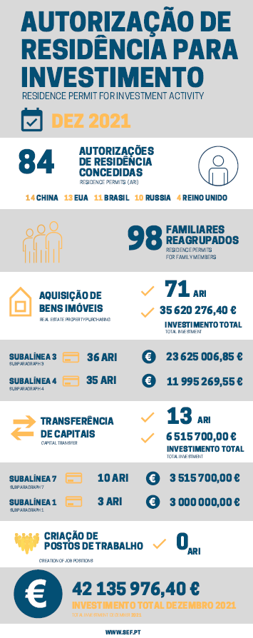 近日,葡萄牙移民局(SEF)公布了2021年12月的黃金簽證數(shù)據(jù)。2021年12月,共有84位主申請(qǐng)人和98位附屬申請(qǐng)人獲批葡萄牙黃金簽證。其中,來(lái)自中國(guó)的主申請(qǐng)人為14位,排名第一。其次是美國(guó)(13位)、巴西(11位)、俄羅斯(10位)、英國(guó)(4位)。