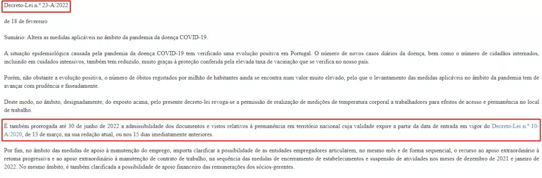 據(jù)葡萄牙部長理事會決議,于2022年2月18日登報生效的Decreto-Lei n.º 23-A/2022 法律,其中明確了在2020年2月24日之后過期的居留卡,其有效期可自動延期至2022年6月30日。自上次延期至2022年3月31日后,此次延期時長再增3個月。