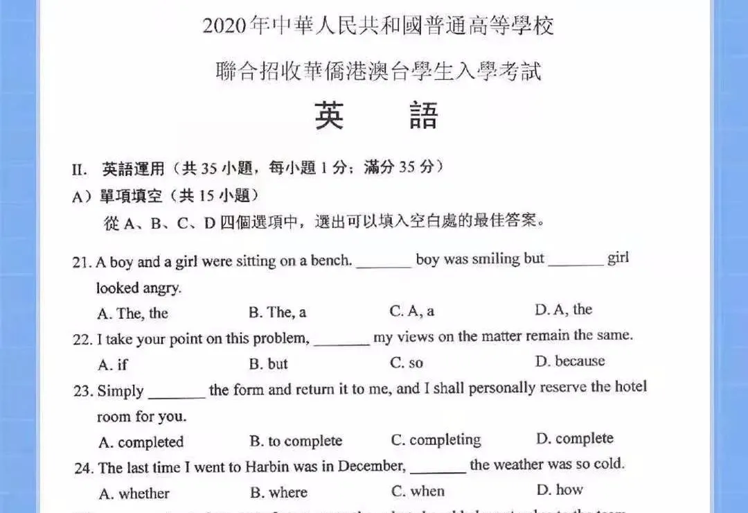 大家來(lái)感受下2020年華僑生聯(lián)考試卷:
