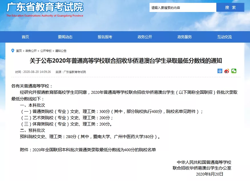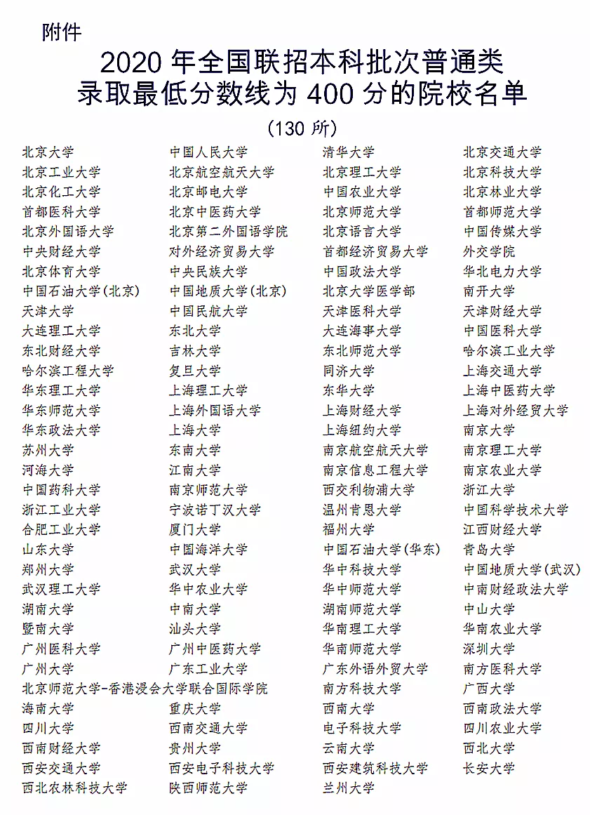 根據(jù)廣東教育考試院發(fā)布的2020年華僑生聯(lián)考錄取最低分?jǐn)?shù)線的信息,僅200分即可入讀藝術(shù)類(lèi)、體育類(lèi)院校,400分即可入讀985、211高校,如清華大學(xué)、北京大學(xué)、復(fù)旦大學(xué)、中國(guó)人民大學(xué)等等。