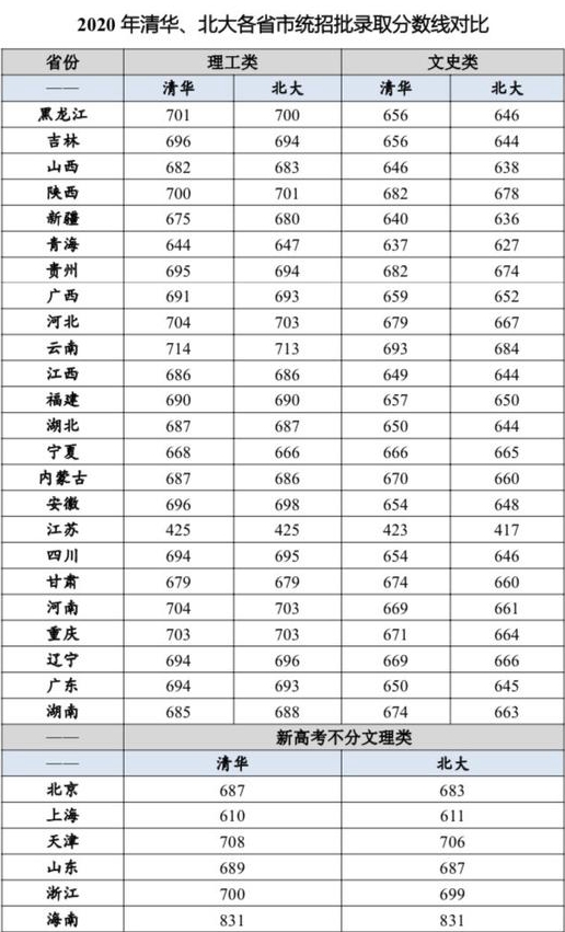 而2020清華、北大各省統(tǒng)招批錄取分?jǐn)?shù)線,理工類(lèi)接近700分,文史類(lèi)約650分,比華僑生錄取分?jǐn)?shù)線整整高出兩三百分。