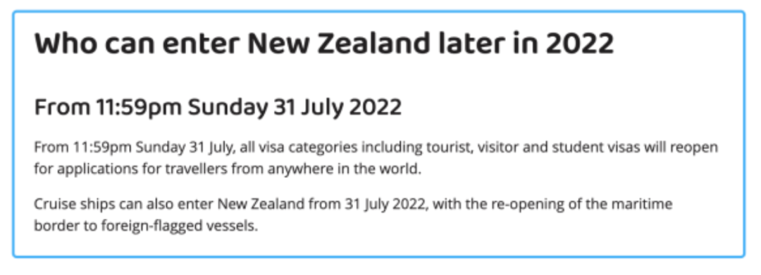 當?shù)貢r間7月31日23時59分,因新冠疫情關閉了兩年多的新西蘭邊境對所有游客和國際學生全面開放,海上邊界也將重開。這一消息意味著:除新西蘭公民、居民以及澳洲公民之外,只要持有有效簽證的人都可以入境新西蘭。國際學生和游輪的回歸,將為教育和旅游業(yè)提供急需的經(jīng)濟動力。注意,入境前需提供獲新西蘭政府認可的新冠疫苗完全接種證明。