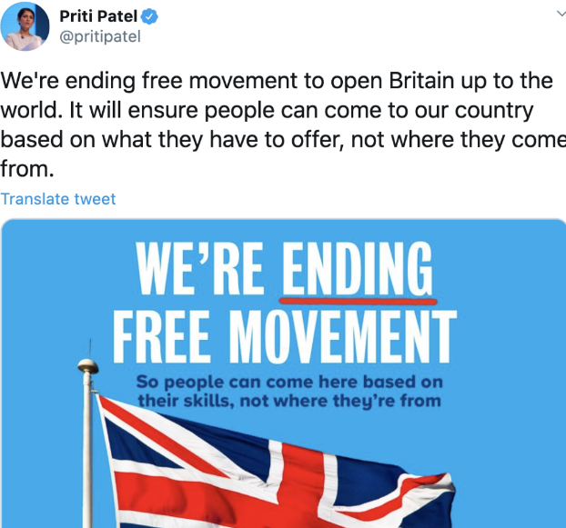 對此,英國內(nèi)政大臣帕特爾表示:“全新的移民法案將徹底終結(jié)歐盟人口自由流動原則,并為我們推行新的積分制移民鋪平道路”。