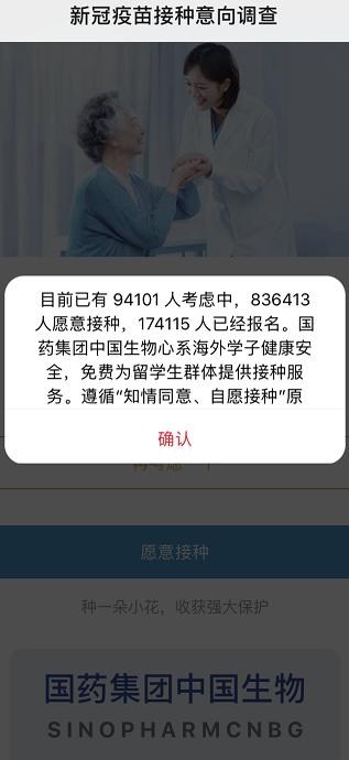 不過,查詢國藥集團(tuán)官網(wǎng)暫未發(fā)現(xiàn)報名通道,同時有公開報道顯示,一款“新冠疫苗接種預(yù)約”(新冠疫苗接種意向調(diào)查)的小程序在不久前的2020年中國國際服務(wù)貿(mào)易交易會上已經(jīng)亮相國藥集團(tuán)中國生物展臺。以上該款小程序的調(diào)查結(jié)果顯示,截至目前,已經(jīng)有接近40萬人表示“愿意接種”,并有超過7萬人已經(jīng)報名接種。該款小程序上還顯示,將免費為留學(xué)生群體提供接種服務(wù)。