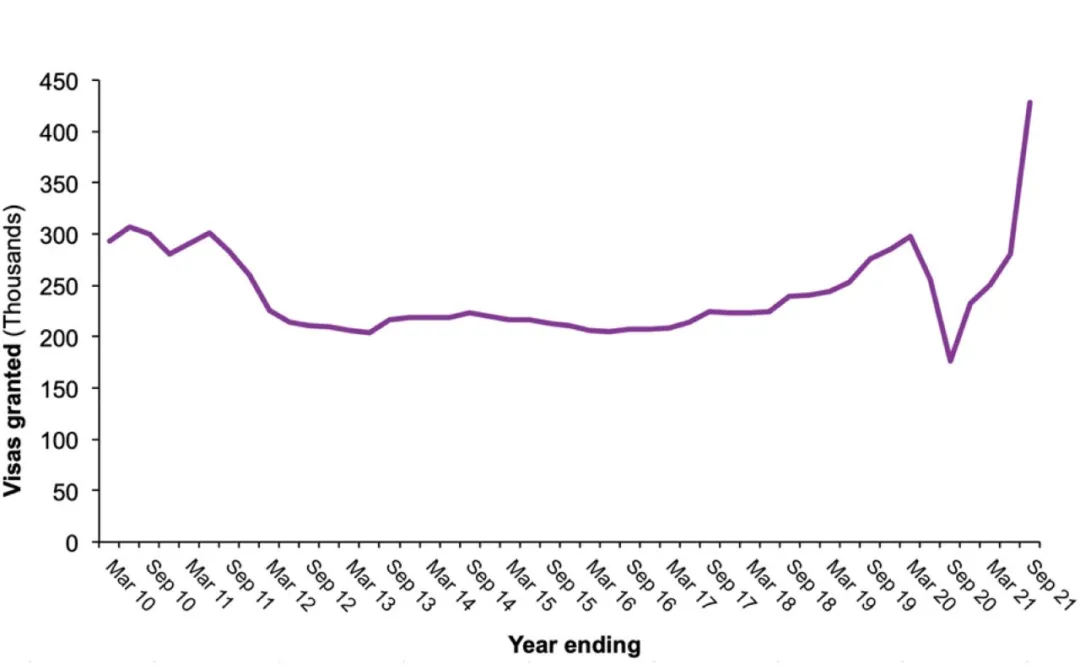 從英國過去十年發(fā)放的擔(dān)保學(xué)生簽證數(shù)量曲線圖我們可以看出,學(xué)生簽證發(fā)放數(shù)量在2012年到2017年期間較為平穩(wěn),在2018和2019年有明顯增加,隨后因新冠疫情影響急劇下降,并在2021年強(qiáng)勁回升。