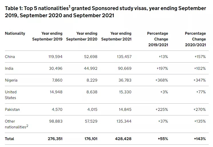 日前,英國內(nèi)政部發(fā)布了最新的《學(xué)生簽證年度數(shù)據(jù)》。數(shù)據(jù)顯示,在截至2021年9月的一年中,內(nèi)政部共計(jì)發(fā)放了428,428份學(xué)生簽證,創(chuàng)歷史新高!同比2020年暴增143%,比疫情前的2019年高出55%。