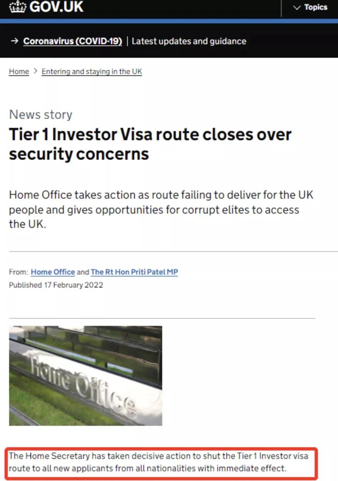 重磅!英國內(nèi)政部2月17日正式宣布,即刻關(guān)閉Tier 1投資移民(Investor)簽證。