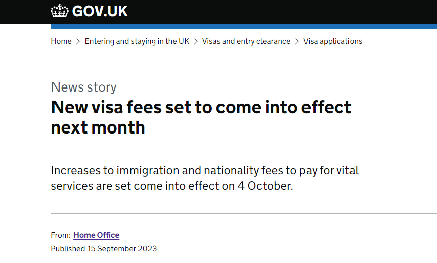 英國(guó)內(nèi)政部9月15日發(fā)布公告:自2023年10月4日起,英國(guó)旅游簽證、學(xué)生簽證及工作簽證等多項(xiàng)簽證費(fèi)用全面上漲,不同簽證類型在英國(guó)境內(nèi)/境外的申請(qǐng)費(fèi)用漲幅各異,下面我們具體看看都有哪些變化吧!也提醒近期有英國(guó)簽證辦理需求的小伙伴們,抓緊辦理哦!
