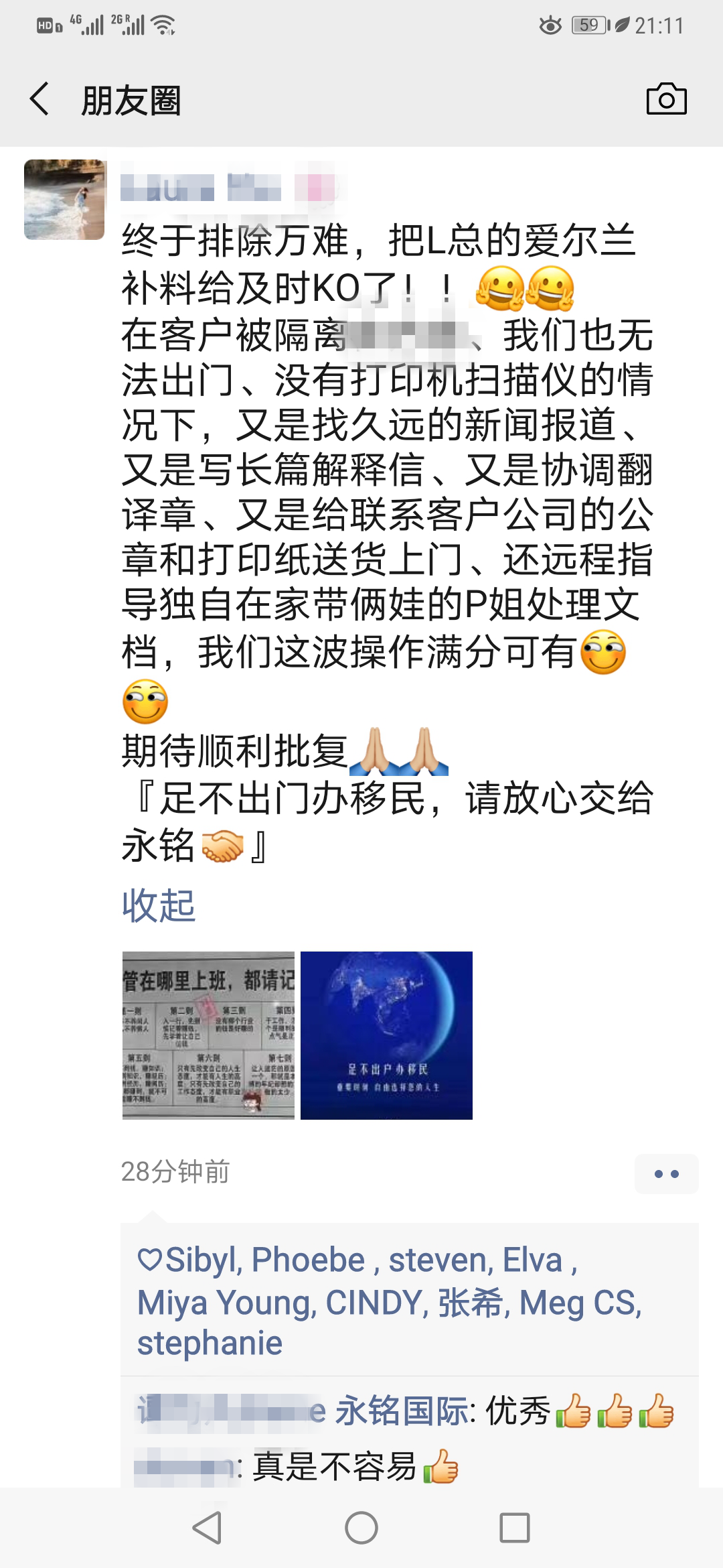 而疫情當(dāng)前,武漢全面封城,在貴賓客戶及我們的工作人員都無法出門的情況下,我們的文件團(tuán)隊(duì)排除各種困難,全程零接觸幫助客戶順利完成移民補(bǔ)料工作。接下來,就等順利批復(fù),愿客戶早日抵達(dá)幸福彼岸。